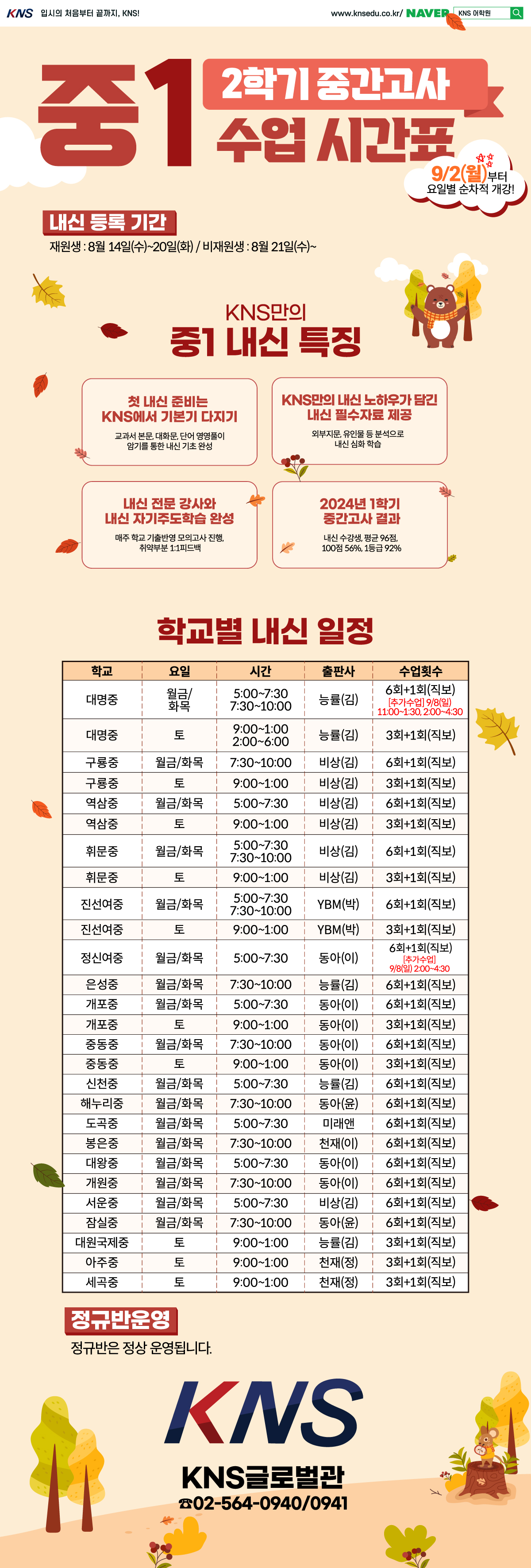 | 제목 | [KNS 중1] 2024 중1 2학기 내신 완벽대비반 안내 | ||||