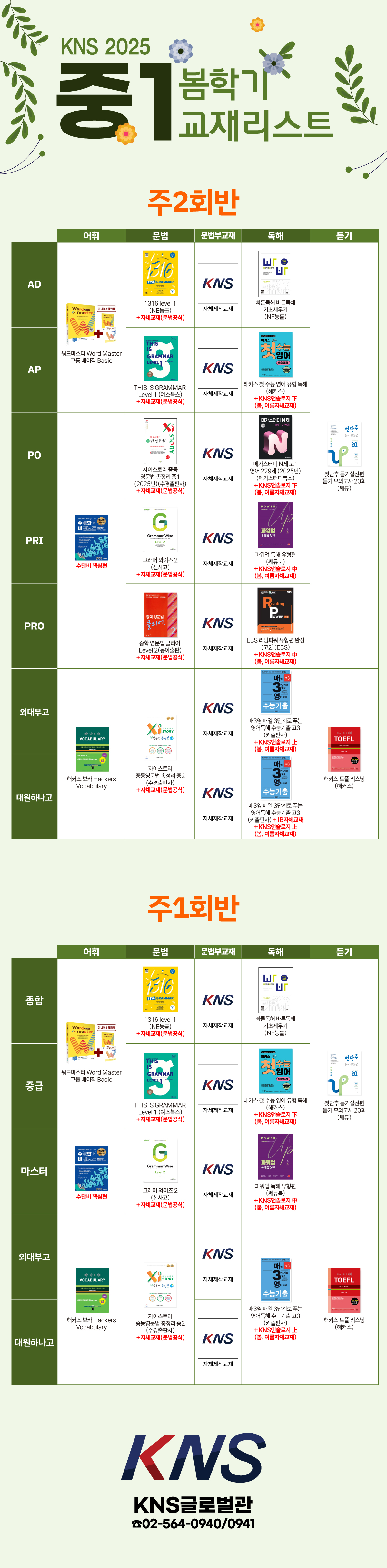 | 제목 | [중1] 2025 봄학기 중1 교재리스트 안내 | ||||